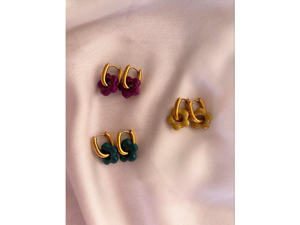 Zelené květy s nádechem vánoční atmosféry mají lehký třpyt a jsou součástí pozlacené náušnice z chirurgické oceli.